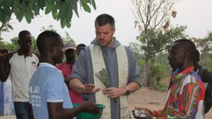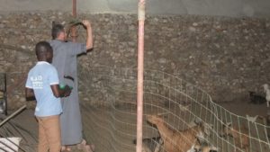 Bénédiction de la bergerie par le Père Jean Maximilien pour implorer la protection divine sur tous ceux qui y travaillent.